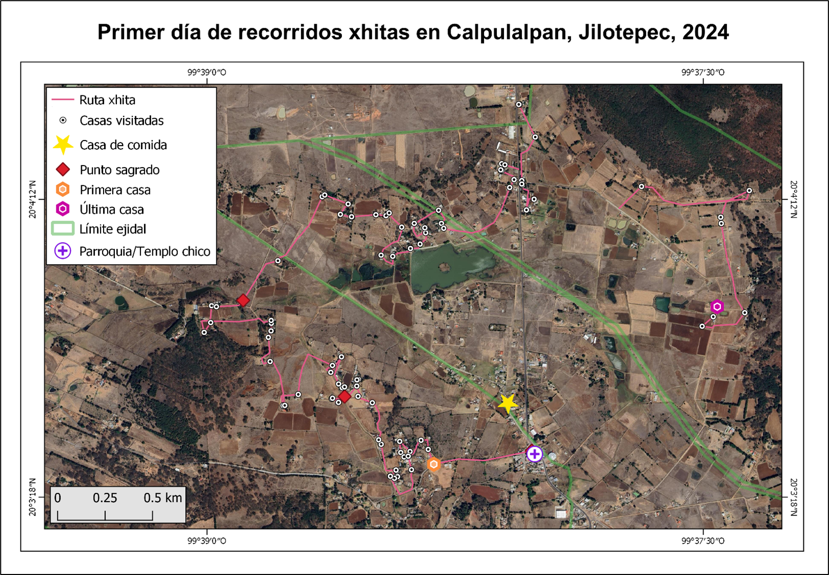 Figura 4 Ruta de los recorridos xhitas durante la primera jornada de la festividad en 2024.