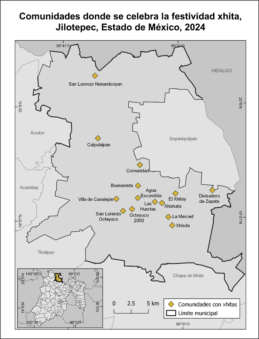 La identidad otomí de Jilotepec, vilipendiada primero por nahuas y purépechas, y más tarde desacreditada también en las versiones novohispana y mexicana de la historia regional, emerge con fuerza en sus procesiones y santuarios todavía. Cabe decir que festividades análogas se presentan al mismo tiempo en la cabecera municipal, Jilotepec de Molina Enríquez, y en al menos ocho pueblos más del municipio según Brambila: Agua Escondida, Buenavista, Comunidad, Las Huertas, La Merced, San Lorenzo Nenamicoyan, San Lorenzo Octeyuco, Xhisda y Xhixhata (Brambila, 2000, p. 25). Reyes Retana (2020) documenta que a partir de 1999 también lo hacen en El Xhitey y en Villa de Canalejas. En 2024, nosotros contabilizamos la fiesta xhita también en Octeyuco Dos Mil y Divisadero de Zapata (localidad situada en los límites de Jilotepec y Soyaniquilpan) (Figura 7).