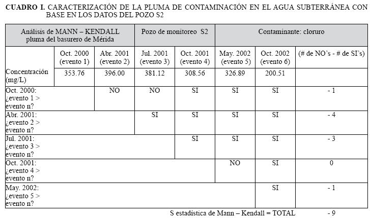 Para confirmar el análisis llevado a cabo por inspección visual de los datos del sitio con el tiempo (Fig. 2), se realizó un análisis estadístico de las tendencias de los datos. Para ilustrar lo anterior, el cuadro I muestra el cálculo de la S estadística de MannKendall para el pozo S2 para seis eventos de muestreo; estos son: octubre de 2000; abril, julio y octubre de 2001; mayo y octubre de 2002. Un valor positivo de S indicaría una tendencia en incremento y para uno negativo, la tendencia sería en decremento. En el cuadro II se presentan los resultados de los pozos ubicados a lo largo del eje principal de la pluma.