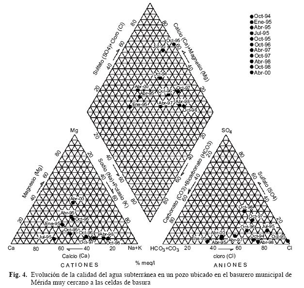 La figura 4 muestra que, dadas las características del sistema, en el acuífero se está llevando a cabo un proceso de atenuación que depende de los procesos naturales que ocurren en él para degradar y eliminar contaminantes. La calidad del agua que inicialmente era de tipo cálcico bicarbonatada, cambia a tipo clorurada sódica debido a la contaminación del lixiviado y actualmente está en proceso de retornar a su calidad original.