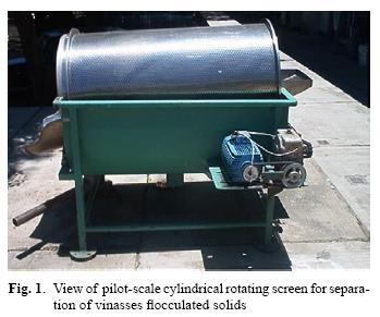 In a second experiment vinasses from different tequila factories were treated with 200 mg/L of PAM and the flocculated solids separated in a pilotscale cylindrical rotating screen separator constructed of oxidized steel (63 cm diameter, 1.22 m length) with 2 mm openings. (fig. 1).