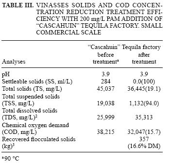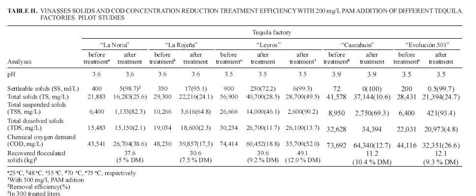 Table II shows the treatment performance of solidliquid separation process using vinasses from 5 different tequila factories. 300 liters of vinasses were treated with 200 mg/L of PAM except for vinasses from "Leyros" tequila factory, that received 400 mg/L of PAM (two times, 200 mg/L each one) due to high solids concentration.