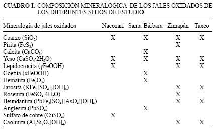 La composición mineralógica de los jales estudiados se presenta en el cuadro I. La mineralogía de estos jales oxidados está dominada por el cuarzo (SiO2) y el yeso (CaSO4.2H2O), que es el mineral secundario más común que caracteriza a los jales oxidados (McGregor et al. 1998, Johnson et al. 2000, Romero et al. 2007). En los jales de Zimapán y Taxco se identificó una mayor variedad de minerales secundarios de Fe como lepidocrocita (γFeOOH), jarosita (KFe3[SO4]2[OH]6), rosenita (FeSO4.4H2O) y beundantita (PbFe3[SO4] [AsO4] [OH]6). Asimismo, en los jales de Taxco se identificó caolinita que es un mineral secundario que proviene de la alteración de los feldespatos potásicos en ambientes ácidos. Esta variedad de minerales secundarios en los jales de Taxco y Zimapán indica que el proceso de oxidación/neutralización ha sido intenso y reflejan la abundancia relativa de los elementos potencialmente tóxicos como el Fe, As y Pb que forman parte de la composición de los minerales identificados.