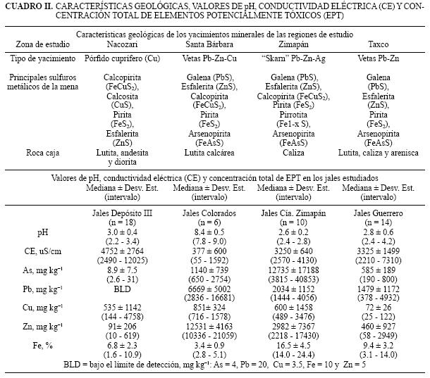 En el cuadro II se presentan los resultados de los valores de pH, conductividad eléctrica (CE) y concentración total de los elementos potencialmente tóxicos analizados (As, Pb, Cu, Zn y Fe).