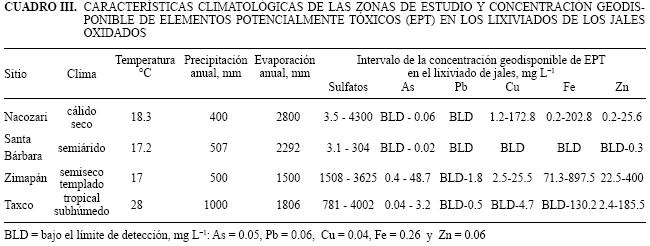 En el cuadro III se presentan las concentraciones de elementos potencialmente tóxicos disueltos en los lixiviados acuosos de los jales (concentraciones geodisponibles). Estos resultados indican que la peligrosidad del drenaje que podría formarse en los jales de los diferentes sitios de estudio descienden en el siguiente orden: Zimapán > Taxco > Nacozari > Santa Bárbara.
