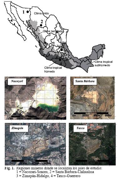 Se seleccionaron jales oxidados de depósitos inactivos que provienen de la explotación de diferentes yacimientos minerales de cobre, plomo y zinc y que se ubican en las regiones mineras de NacozariSonora, Santa BárbaraChihuahua, ZimapánHidalgo y TaxcoGuerrero (Fig. 1). En las zonas de estudio existen condiciones geológicas y climáticas diferentes.