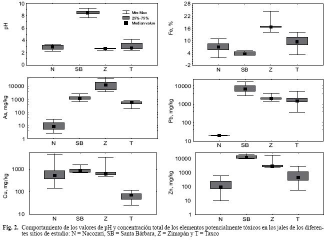 En general, los valores de las concentraciones totales de los elementos potencialmente tóxicos en los jales de los diferentes sitios de estudio (Cuadro II, Fig. 2) decrecen en el siguiente orden: Zimapán > Santa Bárbara > Taxco > Nacozari.