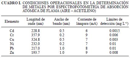 Fracción intercambiable: 1 g de muestra seca y cribada, se puso en un tubo de centrífuga de polipropileno con 15.2 mL de ácido acético 0.11 M. La muestra se agitó (agitador horizontal Thermolyne) durante 16 horas a temperatura ambiente y a 40 rpm. El extracto se separó del residuo sólido por medio de centrífuga (Beckman GS15R) a 2400 rpm durante 20 minutos. El líquido decantado se filtró a través de papel Whatman No. 40 y se almacenó a 4 °C en un recipiente de polietileno, hasta su análisis por espectrofotometría de absorción atómica (Varian modelo AA1475). Se utilizaron estándares 1000 mg L1 (Merck) de cada elemento y se empleó agua tridestilada para su preparación. Las condiciones de operación del equipo se muestran en el cuadro I.