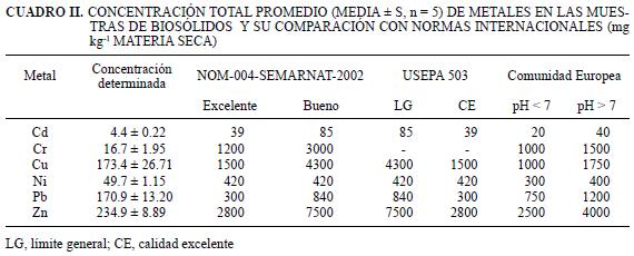 En la figura 1 se muestran los valores promedio obtenidos de las concentraciones totales de Cd, Cr, Cu, Ni, Pb y Zn y en el cuadro II se comparan con los límites permisibles establecidos en materia de disposición de lodos residuales o biosólidos, por la legislación mexicana (NOM004SMARNAT2002), la correspondiente establecida para la Comunidad Económica Europea por el Council of the European Communities (CEC 1986) y la estadounidense USEPA (1995).