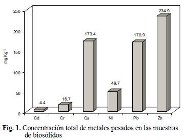 Se observa que, en general, las concentraciones totales de los metales pesados analizados no rebasan las concentraciones máximas permitidas por las tres normatividades. Los metales que presentaron las concentraciones más altas fueron Cu, Pb y Zn, y las más bajas estuvieron asociadas con Cd, Cr, y Ni. Estos resultados son similares a los encontrados en estudios llevados a cabo para biosólidos con características similares (Fuentes et al. 2004), es decir provenientes de una planta de tratamiento de aguas residuales municipales y digeridos anaeróbicamente para su estabilización.