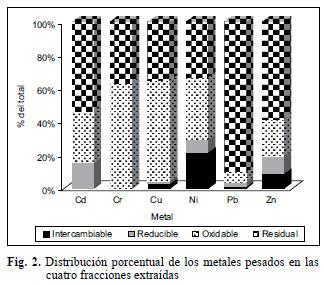 En la figura 2, se muestra la distribución porcentual de los metales analizados en todas las fracciones extraídas. En general se observa que todos tienen mayor presencia en las fracciones oxidable y residual, las más estables. Su presencia en la fracción intercambiable es menor para todos. Cd, Pb y Zn tuvieron sus porcentajes más altos en la fracción residual. Cr, Cu y Ni en la fracción reducible. Los metales que tuvieron los mayores porcentajes en la fracción intercambiable fueron el Ni y el Zn.