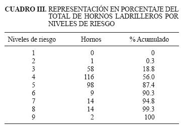 El cuadro II especifica el resultado de la evaluación de los 312 hornos ladrilleros que operan actualmente en la ciudad. Para las dieciséis zonas ladrilleras se presenta el número de hornos totales y su distribución de acuerdo a los niveles de riesgo obtenidos. Sectores ladrilleros importantes como el México 68, Satélite y el Km 20, los cuales en conjunto agrupan más de 70 % de los hornos, se encuentran localizados en áreas que resultaron con valores por debajo de cinco, representando alto riesgo para la población. El cuadro III resume el porcentaje acumulado de hornos por niveles de riesgo; 90.3 % de los hornos resultaron estar ubicados en áreas de mediano a alto nivel de riesgo.