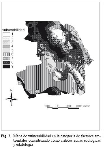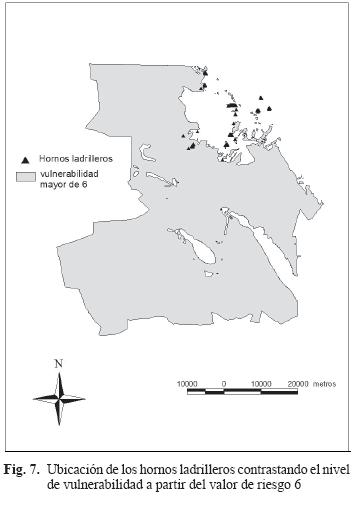 Los diecisiete factores ponderados listados en el cuadro I fueron cartografiados digitalmente en el SIG con la extensión Spatial Analysis®. Se generaron corredores de distancias en mapas con los datos ponderados normalizados, N. Mediante el uso de álgebra de mapas se obtuvieron polígonos con diferente grado de vulnerabilidad o riesgo hacia la población y el ecosistema. Con este mapa de vulnerabilidad se evaluó el grado de impacto de las ladrilleras.