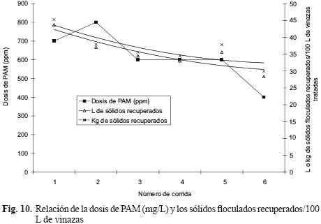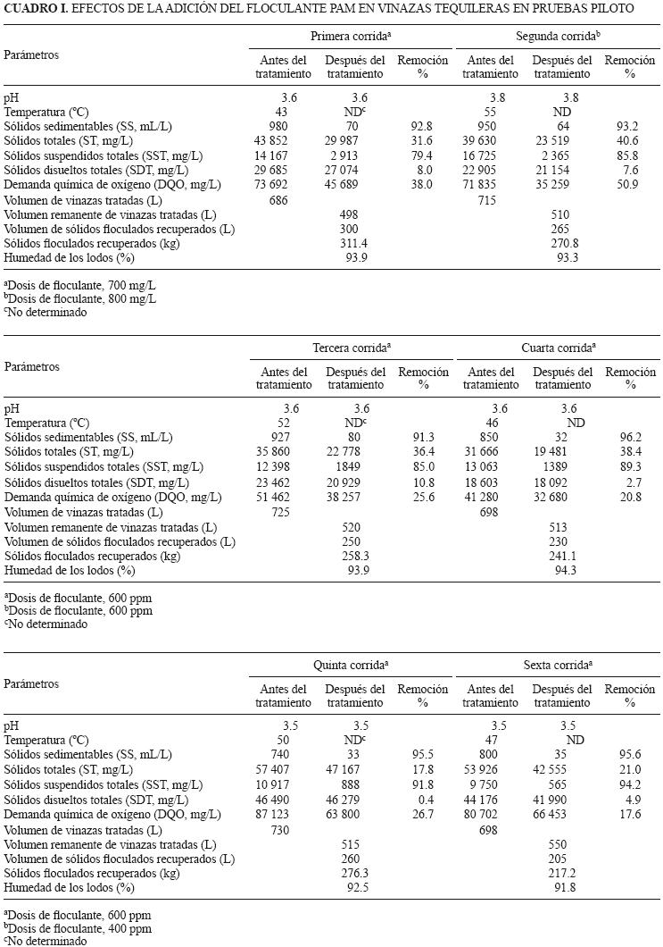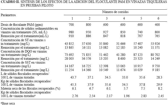 Tratamiento por lote. El cuadro I presenta los resultados de seis corridas realizadas en las pruebas de planta piloto; se determinó la temperatura de las vinazas antes de la adición del floculante, así como pH, SS, ST, SST, SDT y DQO antes y después del tratamiento con diferentes dosis de PAM. En las corridas se consideró el volumen de vinazas tratadas para determinar el volumen de sólidos floculados recuperados y por diferencia conocer el volumen remanente de vinazas para neutralizarse o ser tratadas en un proceso posterior. También se determinó el peso de sólidos floculados separados, así como su contenido de humedad.