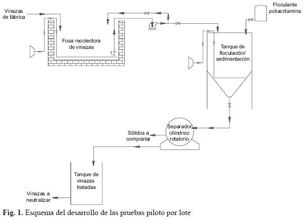 Para los estudios por lote se realizaron seis corridas, la primera, segunda y sexta con 700, 800 y 400 mg de floculante/L de vinazas respectivamente y la tercera, cuarta y quinta con 600; en cada una de ellas se trabajó de la siguiente manera: las vinazas homogeneizadas en la fosa de captación se bombearon hasta el contenedor de coagulación/floculación, de donde se tomó una muestra de 5 litros de vinazas sin tratar una vez mezcladas con aireación. La adición del floculante hasta la dosis deseada (400, 600, 700 y 800 mg de floculante/L de vinazas) se hizo por medio de la abertura de una llave de paso del contenedor mientras las vinazas eran mezcladas con aire. Después de la adición del floculante, el líquido se dejó decantar durante 45 minutos antes de abrir la llave para la separación de flóculos en el separador cilíndrico rotatorio; el tiempo de descarga fue de 30 minutos. Del sobrenadante se tomaron muestras para el análisis químico posterior (SS, ST, SST, SDT sólidos disueltos totales, y DQO). En cada una de las corridas se tomaron muestras de vinazas con y sin tratamiento para el análisis de pH, SS, ST, SST, SDT y DQO. En cada corrida se hizo un balance entre el volumen de vinazas sin tratar y el volumen de flóculos recuperados y vinazas tratadas. De una muestra compuesta de flóculos recuperados se determinó el contenido de agua, nitrógeno total Kjeldahl (NTK), cenizas, materia orgánica, carbono orgánico total, pH, conductividad, total de P, K, Ca, Mg, Na, Cu, Be, Al, Ba, Cd, Cr, Pb, Co, Fe, Mn, Mo, Ni, Ag, Zn, Sb, Tl y V.