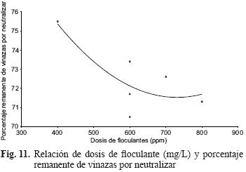 La figura 10 presenta la relación de la dosis de PAM (ppm) y los sólidos floculados recuperados/100 L de vinazas. Como prueba de los resultados anteriores en los que se vio que a mayores dosis de PAM (mg/L), mayores remociones de SS (mL/L), ST (mg/L), DQO (mg/L) y SST (mg/L), en esta figura se presenta que a mayor dosis de PAM, mayor recolección de L o kg de sólidos floculados/100 L de vinazas tratadas. En el tratamiento con 700 mg/L de PAM se recolectaron 43.7 L de sólidos/100 L de vinazas, mientras que con 400 mg/L se recolectaron 28.3 L. Por otro lado, en la figura 11 se muestra que a mayor dosis de floculante y mayor recolección de sólidos floculados/100 L de vinazas tratadas, menor volumen de vinazas remanentes por neutralizar.