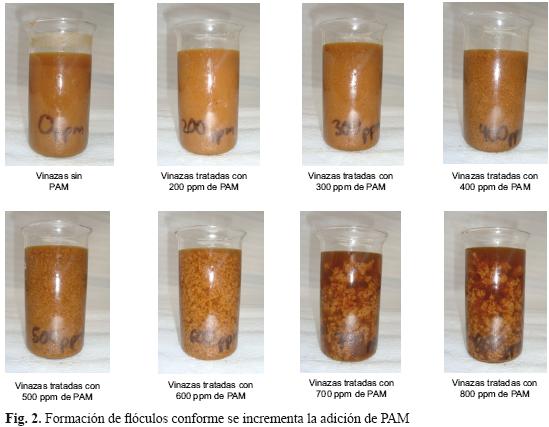 Pruebas de floculación. En la figura 2 se presentan los resultados gráficos de cómo evolucionó la coagulación y formación de flóculos conforme se incrementaba la adición de PAM (200, 300, 400, 500, 600, 700 a 800 mg/L) en vinazas tequileras con pH de 3.8 y una concentración de ST de 39 630 mg/L. Íñiguez y Peraza (2007), trabajando en pruebas de laboratorio con muestras de 500 mL de vinazas, encontraron buenas formaciones de flóculos con concentraciones de PAM de 20 a 180 mg/L, pero con concentraciones de SS y ST de 150 mL/L y 26 267 mg/L, respectivamente. En pruebas con 200 L de vinazas de cinco fábricas diferentes de tequila, también tuvieron buenas formaciones de flóculos utilizando 200 mg/L de PAM, al tener concentraciones de SS desde 72 hasta 400 mL/L y de ST desde 21 883 hasta 41 578 mg/L. En vinazas con 900 mL/L de SS y 56 900 mg/L de ST se utilizó una concentración de 400 mg/L de PAM para tener una buena formación de flóculos, con remociones de SS y ST de 99.3 y 49.5 %, respectivamente.