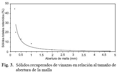 Análisis físico de partículas. La figura 3 presenta el porcentaje de sólidos totales (ST) recuperados de muestras de vinazas sometidas a pruebas de filtración en mallas con abertura de 0.25, 0.50, 1.0, 1.98 y 4.76 mm. Como se puede observar en la figura, entre más cerrada es la malla, mayor es el porcentaje de ST recuperados, de tal manera que al utilizar una malla con una abertura de 0.25 mm se recuperó hasta 20.3 % de los ST; sin embargo, existe el inconveniente de una lenta velocidad de drenado, lo cual dificultaría la operación en planta para la remoción de ST. En cambio, como se puede apreciar en esta misma figura, al utilizar el floculante PAM, se recuperó hasta 45 % de los ST con la misma abertura de malla (0.25 mm) sin problemas de drenado, lo cual justifica su utilización para la remoción de una parte importante de los ST.
