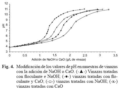 Pruebas de neutralización. La figura 4 presenta los cambios de pH para vinazas con y sin la adición de PAM al añadirse hidróxido de sodio (NaOH) y cal viva (CaO). Las vinazas para esta prueba tuvieron un pH de 3.8 y una concentración de ST de 23 519 mg/L (vinazas tratadas con PAM) y 39 630 mg/L (vinazas no tratadas). Las vinazas sin PAM necesitaron de mayores cantidades de NaOH y CaO para alcanzar valores de pH 11, lo que significa que el contenido de sólidos en las vinazas influye en el mayor consumo de reactivos. Por otro lado, para alcanzar valores de neutralización (pH 7) en las vinazas con y sin tratamiento, se requirió de menor cantidad de CaO que de NaOH, a pesar de que el segundo era grado reactivo. Para alcanzar pH 7 en vinazas tratadas con PAM, se requirieron 1.26 g/L de CaO y 1.7 g/L de NaOH. En cambio, en vinazas no tratadas con PAM, se requirieron 1.5 g/L de CaO y 1.95 g/L de NaOH. Esto definitivamente favorece la neutralización de vinazas al utilizar menos reactivo de un compuesto químico más barato. En la neutralización de vinazas obtenidas de la producción de alcohol a partir de la fermentación de mieles finales de caña de azúcar, Bermúdez et al. (2000) reportaron resultados inversos, ya que para neutralizar sus muestras de vinazas se requirió de menor cantidad de sosa cáustica que de cal viva (4.98 y 10 g/L, respectivamente).
