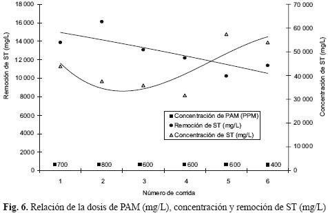 La figura 6 presenta la relación de dosis de PAM (mg/L), concentración y remoción de los ST en muestras de vinazas. En la figura se aprecia que a mayor dosis de PAM (mg/L), mayor remoción de ST; aparentemente, la concentración de ST en las vinazas sin tratamiento no influye en la remoción, ya que teniendo la misma dosis de floculante, en la cuarta corrida se removieron 12 185 mg/L (concentración inicial, 31 666 mg/L) y en la quinta 10 240 mg/L (concentración inicial, 57 407 mg/L).