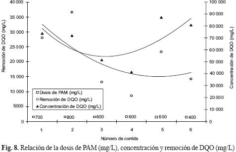 La figura 8 presenta la relación de dosis de PAM (mg/L), concentración y remoción de la DQO (mg/L) en muestras de vinazas. Al igual que en los casos anteriores, a mayor dosis de floculante (mg/L), mayor remoción de DQO (mg/L). En este caso, los valores de remoción tuvieron que ver con la concentración inicial de la DQO (mg/L), de tal manera que con la misma dosis de PAM, a mayor concentración de DQO (mg/L), mayor valor de remoción. En las corridas 3, 4 y 5, en muestras con una DQO de 51 462, 41 280 y 87 123 mg/L, se removieron 13 205, 8600 y 23 323 mg/L, respectivamente.