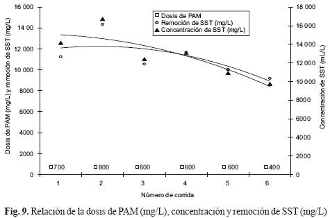 La figura 9 presenta la relación de dosis de PAM (mg/L), concentración y remoción de los SST (mg/L). En esta figura se aprecia que la remoción de SST (mg/L) se vio influenciada también por el valor de la dosis del PAM (mg/L), de tal manera que a mayor dosis, mayor remoción de SST (mg/L), sin aparente influencia de la concentración inicial en las muestras de vinazas. En las corridas 3, 4 y 5, en donde se utilizó la misma dosis de PAM (mg/L), se tuvieron remociones (10 549, 11 674 y 10 029 mg/L, respectivamente) relativamente proporcionales a las concentraciones de SST (12 398, 13 063 y 10 917 mg/L, respectivamente).