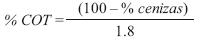 Para el análisis de SS las muestras se vertieron en conos Imhoff de un litro para dejarse sedimentar durante 45 minutos. Se utilizó una varilla de vidrio para retirar los sólidos floculados pegados en las paredes del cono, dejando reposar los flóculos por 15 minutos más para completar una hora de prueba. Los resultados se leyeron y reportaron en mL/L (APHA 1992). Los ST se determinaron mediante el calentamiento y secado de muestras, calculándolos en mg/L al comparar el peso inicial con el final (APHA 1992). Para medir la concentración de SST se pesaron filtros de fibra de vidrio, puestos previamente a peso constante; se colocaron los filtros en un embudo de filtración sujeto a vacío y se pasó un volumen conocido de la muestra a través de los filtros, posteriormente se secaron en una estufa, se enfriaron y se pesaron. La concentración de SST se calculó con base en la diferencia del peso previo y posterior al secado (APHA 1992). Los resultados se reportaron en mg/L. Los SDT se calcularon por la diferencia de los ST y SST (APHA 1992). La DQO fue determinada mediante un sistema de reflujo y un método colorimétrico (APHA 1992). Para medir la temperatura de las muestras se utilizó un termómetro de mercurio de escala Celsius de 0 a 150 °C, el cual se sumergió en la muestra; cuando la columna de mercurio se estabilizó, se tomó la lectura. Los valores de pH fueron determinados con un potenciómetro Hanna (modelo 21 Hanna Instruments, Portugal) en escala de unidades estándar de 0 a 14. Para los flóculos, el contenido de agua se determinó mediante el secado de una muestra por 24 h a 105 °C, comparando el peso inicial y final; el resultado se reporta en % (AOAC 1990). El NTK se determinó de acuerdo a la técnica descrita por la AOAC (1990), utilizando mezcla selénica como catalizador y ácido bórico a 4 % para captar el amoniaco. Para el análisis de cenizas se puso una muestra de peso conocido en una mufla a 550 °C por 2 h; el peso del material residual se consideró como el contenido de cenizas. El material volátil fue considerado como materia orgánica (Bateman 1970). El pH y la conductividad de las muestras sólidas fueron determinados de extractos en agua en una relación peso/volumen 1:5 (CWMI 1995). El pH se midió con un potenciómetro Hanna y la conductividad se determinó con un medidor modelo 407303 Extech, Instruments. El carbono orgánico total (COT) fue calculado mediante la siguiente ecuación (Golueke 1977):