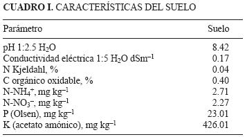 El ensayo en invernadero se llevó a cabo en Madrid, con sorgo (Sorghum bicolor (L.) Moench) cv. Digestivo, en condiciones controladas de temperatura y humedad. Se utilizaron tiestos de polipropileno flexible de 0.1 m2 de superficie y 26 L de capacidad, con drenaje, que se rellenaron con 26 kg de suelo de la finca "La Canaleja" (Madrid), que previamente se mezcló con las dosis de fertilizante mineral y gallinazas. Las características del suelo utilizado se presentan en la cuadro I.