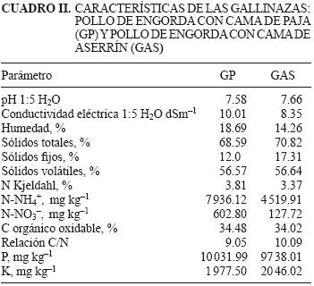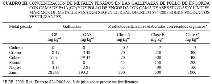 Las gallinazas de pollos de engorda usadas en este ensayo provenían de dos granjas situadas en la Comunidad de Castilla y León (Delgado et al. 2007), sus características se presentan en el cuadro II, estaban constituidas por mezcla de heces, plumas y la cama de paja de cebada (GP) o la cama de aserrín de madera (GAS). El nitrógeno se determinó por el método de Kjeldahl (Ministerio de Agricultura, Pesca y Alimentación 1994). El nitrógeno inorgánico (NNH4+ y NNO3) se determinó por destilación de arrastre de vapor (Bremmer y Edwards 1965). El carbono orgánico oxidable se determinó por el método de Walkey y Black (Ministerio de Agricultura, Pesca y Alimentación 1994). P y K totales se midieron por los procedimientos descritos por la AOAC (1997). Se determinaron pH suelo/agua= 1:2.5 y conductividad eléctrica en una relación suelo/agua= 1:5.0. Se determinaron los sólidos totales, los sólidos fijos y los sólidos volátiles en GP y GAS (APHA, AWWA, WPCF 1992). En la cuadro III se presenta el contenido en metales pesados de las gallinazas, junto con los límites máximos de estos metales permitidos para productos fertilizantes elaborados con residuos orgánicos según sea su clase A, B ó C, fijados por el Real Decreto 824/2005 (RD), del 8 de julio, sobre productos fertilizantes (BOE 2005). Las gallinazas utilizadas en este ensayo se clasificarían dentro de la clase A la GAS y en la clase B la GP. El RD refleja que los productos fertilizantes elaborados con componentes de origen orgánico se aplicarán al suelo siguiendo los códigos de buenas prácticas agrarias, con la única limitación de uso para los productos de la clase C, de los que dice que no podrán aplicarse sobre suelos agrícolas en dosis superiores a cinco toneladas de materia seca por ha y año.