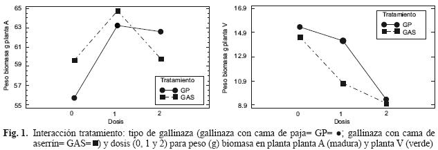 En las figuras 1 y 2 se presentan las gráficas de la interacción (tratamiento tipo de gallinaza (GP y GAS) × dosis (0, 1 y 2) de los ANOVA realizados para biomasa V y A y para °Bx V y A.