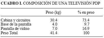 Una pantalla PDP, es un dispositivo electrónico que funciona mediante el fenómeno de liberación de rayos UV de gases nobles cuando se les aplica voltaje, los cuales al interactuar con fósforos, producen los rayos visibles. Una pantalla de PDP esta integrada por millones de celdas que poseen fósforos rojos, verdes y azules y están ubicadas entre 2 placas de vidrio selladas al vacío que contienen gases nobles (xenón, neón, argón y helio), por las cuales atraviesan un par de electrodos horizontales y un electrodo vertical. La televisión de plasma está formada por los circuitos electrónicos y la pantalla PDP. En el cuadro I se indica la composición de una televisión PDP y el peso de cada componente (cabina, circuitos, base de pantalla y la pantalla de vidrio).