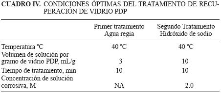Por cada gramo de vidrio PDP se requieren 3 mL de agua regia, 10 mL de hidróxido de sodio y 2 mL de agua para enjuagar el vidrio recuperado. Se generan 15 mL de residuos líquidos.