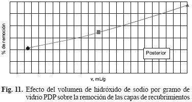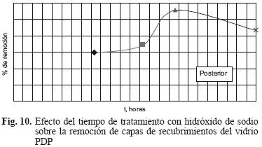 Los resultados obtenidos del estudio previo de remoción de las capas de vidrio bajo condiciones ácidas y alcalinas, permitieron determinar el efecto que producen las mejores condiciones de remoción de capas en las muestras de vidrio. Las figuras 411 (5, 6, 7, 8, 9, 10) muestran el comportamiento de los agentes corrosivos en ambiente ácido y alcalino. En todos los casos, el porcentaje de remoción calculó de la siguiente forma: % de Remoción=100 × (peso inicial peso final) / (peso inicial).