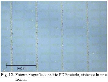 Las condiciones óptimas de tratamiento se ilustran en el cuadro IV. Se observa que los porcentajes de remoción de las capas del vidrio PDP frontal y posterior, son 3.22 % para el vidrio frontal y 5.14 % para el vidrio parte posterior (8.36 %). El proceso de recuperación remueve el 97 % en peso de las capas de recubrimientos, 100100 × (8.638.36)/(8.63). Las figuras 12 y 13 muestran la apariencia de las caras de vidrio después de la remoción de las capas de recubrimientos del vidrio PDP caras frontal y posterior, respectivamente.