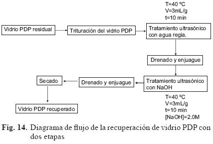De acuerdo con los resultados obtenidos, se recomientada un proceso de dos etapas de tratamiento para limpiar el vidrio PDP y su posterior recuperación mediante lavados corrosivos ácidos y alcalinos con ultrasonido (Fig. 14).