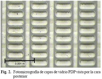 Dos placas de vidrio, en la parte frontal y parte posterior son presentadas en las Figs. 1 y 2 respectivamente, con sus electrodos dispuestos en una configuración hueca y numerosas barreras divisoras pequeñas y un espacio entre ellas para contener el gas de descarga y que la estructura selle bajo presión. Después de cargar la PDP con el gas en el espacio entre las placas superior e inferior, los rayos ultravioleta son generados a través de una descarga eléctrica y son inducidos a la capa de fósforos para producir la luz visible.