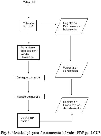 Se cortaron muestras de vidrio PDP de la parte frontal y parte posterior de dimensiones por debajo de 1 cm2. Cada muestra se pesó y el valor de ese dato se registró para evaluar el porcentaje de remoción. Se utilizó solución corrosiva en exceso (V=30 mL) para asegurar que esto no fuera un factor limitante en la remoción de los óxidos. Posteriormente se llevó a calentamiento esta solución corrosiva en un frasco cerrado y puesto dentro del lavador ultrasónico hasta alcanzar su equilibrio térmico a una temperatura de 40 °C. Las muestras se colocaron en la solución para llevar a cabo su digestión durante una hora. El vidrio tratado fue retirado de la solución y enjuagado con agua destilada para eliminar la solución corrosiva. Posteriormente, las muestras fueron llevadas a un ciclo de secado. El peso del vidrio después de su tratamiento se registró para realizar el cálculo del porcentaje de remoción y eficiencia de la solución corrosiva LCUS.