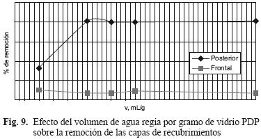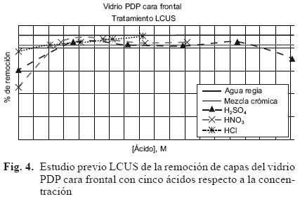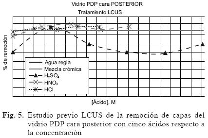Para el caso del vidrio posterior se observa un comportamiento similar (Fig. 5), el agua regia alcanza una remoción de 5.15 %, mientras que para las soluciones de ácidos sulfúrico, nítrico y clorhídrico, el porcentaje de remoción varía por efecto de la concentración. En ambos casos la mayor remoción se obtuvo con agua regia.