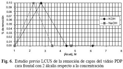 Para el caso de los tratamientos corrosivos alcalinos se observa que para el vidrio frontal (Fig. 6), el porcentaje de remoción mayor (0.10%) se obtiene con 2M de NaOH, mientras que el mismo valor de remoción se obtiene con una concentración de 3M de KOH. Por simplicidad y minimización en el manejo de reactivos, se considera que la mejor solución corrosiva alcalina es la 2M de NaOH. Para el caso de la cara posterior (Fig. 7), el mayor porcentaje de remoción (0.21 %), se logra con 1.0M de NaOH, observándose una disminusión en la remoción al incrementar la concentración de NaOH, debido a factores de solubilidad de los óxidos metálicos formados por disolución de las capas en el vidrio posterior. Se considera que la solución corrosiva alcalina de 1.0M de NaOH es la mejor para el lavado alcalino.