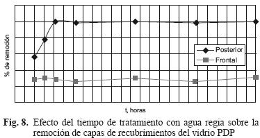 Para el caso del tratamiento con agua regia, se encontró un tiempo óptimo de 10 min para el vidrio de la cara posterior (remoción=5.0 %), después de 10 min el porcentaje de remoción permanece constante. En el caso de la cara frontal, empleando la misma solución de lavado corrosiva, no existe variación significativa del % de remoción en función del tiempo (remoción = 3.2 %), por tanto, se optó por un periodo de tratamiento de 5 min.