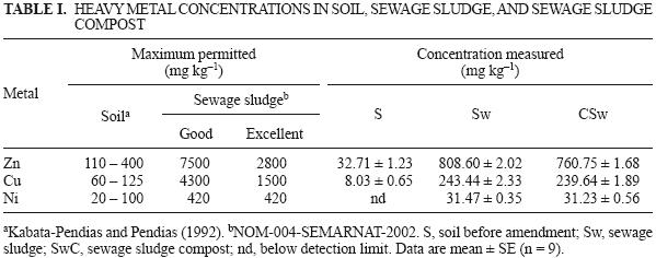 Sewage sludge (Sw) was collected from a municipal wastewater treatment company called ECOSYS in Toluca, Mexico. For compost, Sw was mixed with fragments of corn stalks as a source of carbon and with shredded tire chips as a bulking agent. The composting was carried out as 55 °C, to kill pathogens and decompose phytotoxic substances, for 35 days in coneshapped, 1.5m diameter static piles with a C/N 3040 ratio according to Garrido et al. (2005).