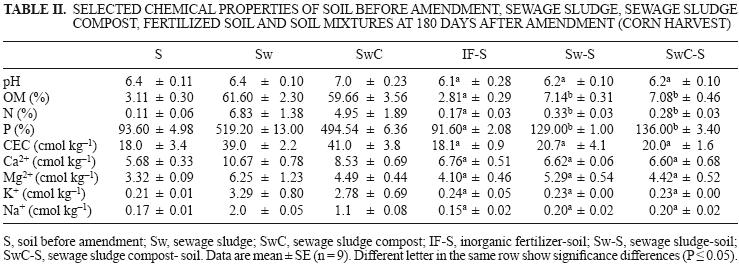 The sewage sludge compost contained less OM than Sw; this could be due to microbial decomposition of carbon and its subsequent release as CO2 (Baziramakenga and Simard 1998), therefore, during the process of composting, OM mass and bulk usually decrease due to the volatilization of organic carbon to carbon dioxide (Peña et al. 1992). The carbon remaining after the biooxidative phase of composting is relatively resistant to microbial degradation (Bernal et al. 1998). The agricultural land application of Sw or SwC increased the content of OM in soil (P ≤ 0.05); at the end of the corn growth cycle, OM increased 2.54 and 2.51fold in SwS and SwCS with respect to IFS, respectively (Table II).