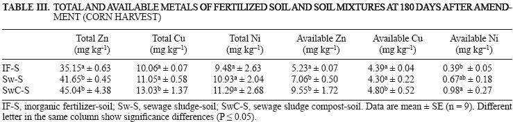 IFS had the lowest total and available concentration of Zn (P ≤ 0.05) (Table III). Total Zn concentration increased in plots amended with compost and sewage sludge due to the contribution of Zn by waste. Special attention is given to Zn if the soil is amended several times with these biosolids, because the Sw and SwC applied to the soil presented high concentrations of this element, which may be available to the plants. However, organic matter helps decrease this effect, because stable complexes are formed, which reduce the availability of this metal (Cripps et al. 1992). Total Zn was negatively correlated with pH (r = 0,645, P ≤ 0.05); at low pH values most of the Zn is present in cationic form (soluble), whereas humate complexes are formed at increased values (Shuman 1999). Zn is an element that reacts with i) organic compounds from sewage sludge, which control its speciation, mobility and bioavailability; ii) organic acids from waste, including substances with Ofunctional groups, and iii) other molecules that form metal complexes; as a result of the properties of organic polyelectrolytes, these complexes reduce the activity of Zn (Martinez and McBride 1999).