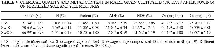Several studies have focused on phytotoxicity caused by heavy metals and elements such as P and N (Kidd et al. 2007, Bose and Bhattacharyya 2008), but only a few works focus on grain quality. In corn and wheat crops, heavy metals such as Cu, Cd, Ni and Zn are accumulated in different parts of the plant, such as leaves, stems and roots, but little is known about their effect on starch, NDF, ADF, protein and nitrogen. In this study, the application of sewage sludge or compost did not significantly affect these chemical parameters in the grain corn (Table V) and no significant differences were observed between treatments (P > 0.05). The quality values found in this work are lower than those established by Llanos (1984), Reyes (1990) and FAO (1993).