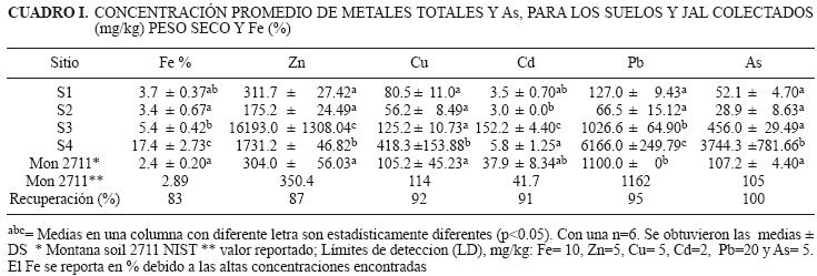 Análisis de las muestras. Las muestras de suelos y jales fueron secadas al aire, homogeneizadas y tamizadas a través de malla 230 de 0.063 mm. Después fueron digeridas con HClHNO3 en horno de microondas (CEM, MARSX press) y las concentraciones de Pb, Zn, Cu, Fe, y Cd se determinaron mediante espectrofotometría de absorción atómica por llama (AAnalist 100, Perkin Elmer) empleados por Wang et al. (2008) y Maldonado et al. (2011) y de As por generación de hidruros (NuñezMontoya et al. 2011). Los análisis de suelo se hicieron en seis réplicas y la calidad de los resultados se evaluó mediante el análisis del material de referencia Montana Soil 2711 NIST por triplicado, obteniendo 83100 % de recuperación.
