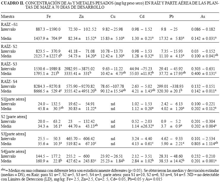 Sin embargo, al analizar las concentraciones de arsénico en la raíz y parte aérea (tallo y hojas) de las plantas de 70 días se encontraron casi en los mismos niveles, con intervalos bajos entre 0.1 a 0.8 mg/kg pero con diferencias significativas entre los sitios; por otro lado, aún en concentraciones bajas se ha observado que el As puede reducir el rendimiento de los cultivos (Peterson 1980). Armienta et al. (2008) determinaron en Prosopis laevigata y Acacia farnesiana elevados contenidos de As, 78.2 y 67.0 mg/kg respectivamente, en una área minera en Zimapán México; estos valores son muy contrastantes con los obtenidos para el maíz en este trabajo. Una de las causas de estas diferencias podría atribuirse a la distinta capacidad de las especies para captar el contaminante.