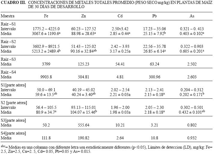 Las concentraciones en las raíces y parte aérea a los 30 días presentaron el siguiente orden: Zn> Fe> Pb> Cd> As. Las concentraciones de arsénico absorbidas por las plantas fueron bajas en ambas partes analizadas a excepción de las raíces en la condición S3 y S4 con 2.5 y 2.6 mg/kg, en el caso del Pb los contenidos en la raíz a los 30 días fueron aproximadamente el doble en relación a los observados a los 70 días. Estos resultados indican que las concentraciones de metales y metaloides tóxicos acumulados en las plantas, en este caso de maíz, pueden variar de acuerdo con la etapa fisiológica de desarrollo en la que se encuentren (Souza et al. 2005, DíazVillaseñor 2006).