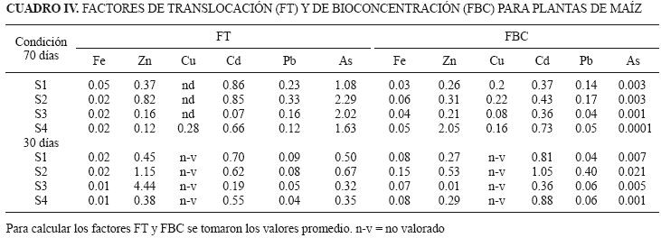 Por otro lado, se determinaron contenidos de MMTOX en las plantas de maíz a los 30 días de desarrollo superiores a los medidos a los 70 días con excepción del As (Cuadro III). Esto puede estar relacionado al efecto plantabiomasa, debido a que la biomasa en las plantas de 70 días es mayor de dos a tres veces en relación con las de 30 días de desarrollo; de acuerdo con la condición se encontraron las siguientes diferencias: para S1 es de 3 y S2, S3 y S4 es de dos veces.