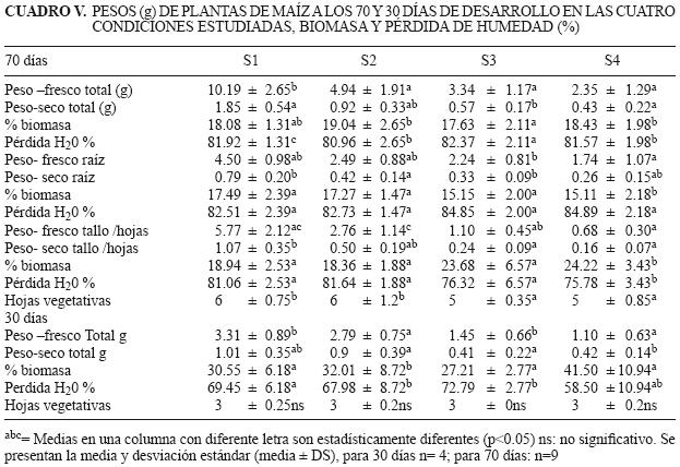 Por otro lado, el tamaño de las hojas a 30 días de crecimiento de la planta fue distinto entre las plantas de los diversos sustratos, así, S1 tuvo un máximo de 28 cm mientras que S4 no rebasó los 13 cm. En el cuadro V se muestran las diferencias encontradas a partir del análisis estadístico (p<0.05) para los pesos frescos y secos así como la biomasa estimada correspondiente a cada condición. La pérdida de biomasa o humedad fue de 58 a 69 % para las condiciones S3 y S4 respectivamente, y la biomasa osciló en un rango de 27 a 42 % para S3 y S4 con diferencias significativas (p<0.05). En la relación del peso total (fresco y seco) de la planta considerando raízparte aérea, se observaron en esta etapa de 30 días diferencias de hasta tres veces entre el peso de S1 (3.31 g) con respecto a S4 (1.10 g). Estadísticamente no se observaron diferencias significativas en el número de hojas vegetativas (3) a un nivel de p<0.05.