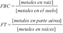 Las concentraciones obtenidas fueron usadas para estimar los factores de translocación (FT) y bioconcentración (FBC). El factor de translocación para los metales en las plantas se calculó como la concentración en la parte aérea dividida entre la concentración en la raíz. El factor de bioconcentración fue expresado por la proporción de la concentración del metal en la raíz sobre la concentración total en el suelo (Tu et al. 2003, Rizzi et al. 2004, Maldonado et al. 2011):